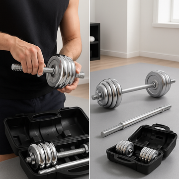 Ensemble 2 en 1 d’haltères, contenant 16 poids, pour des exercices à une ou deux mains. Très facile à ranger et à transporter, il permet un entraînement corporel varié.