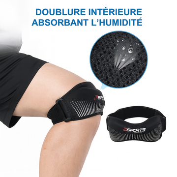 Exerce une pression localisée sous la rotule, soulageant les douleurs liées au genou du coureur, du sauteur ou à la tendinite rotulienne.