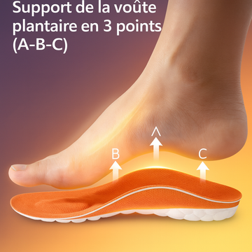 Conception 3 points A-B-C qui soulève et stabilise la voûte pour soulager les talons, chevilles et genoux.