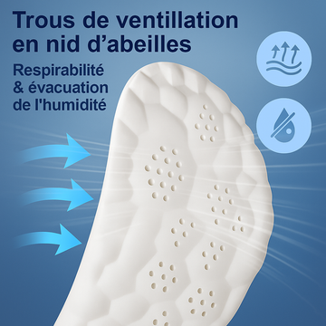 Structure alvéolée avec trous d’aération qui garde les pieds frais, secs et sans odeurs, même lors d’efforts intenses.